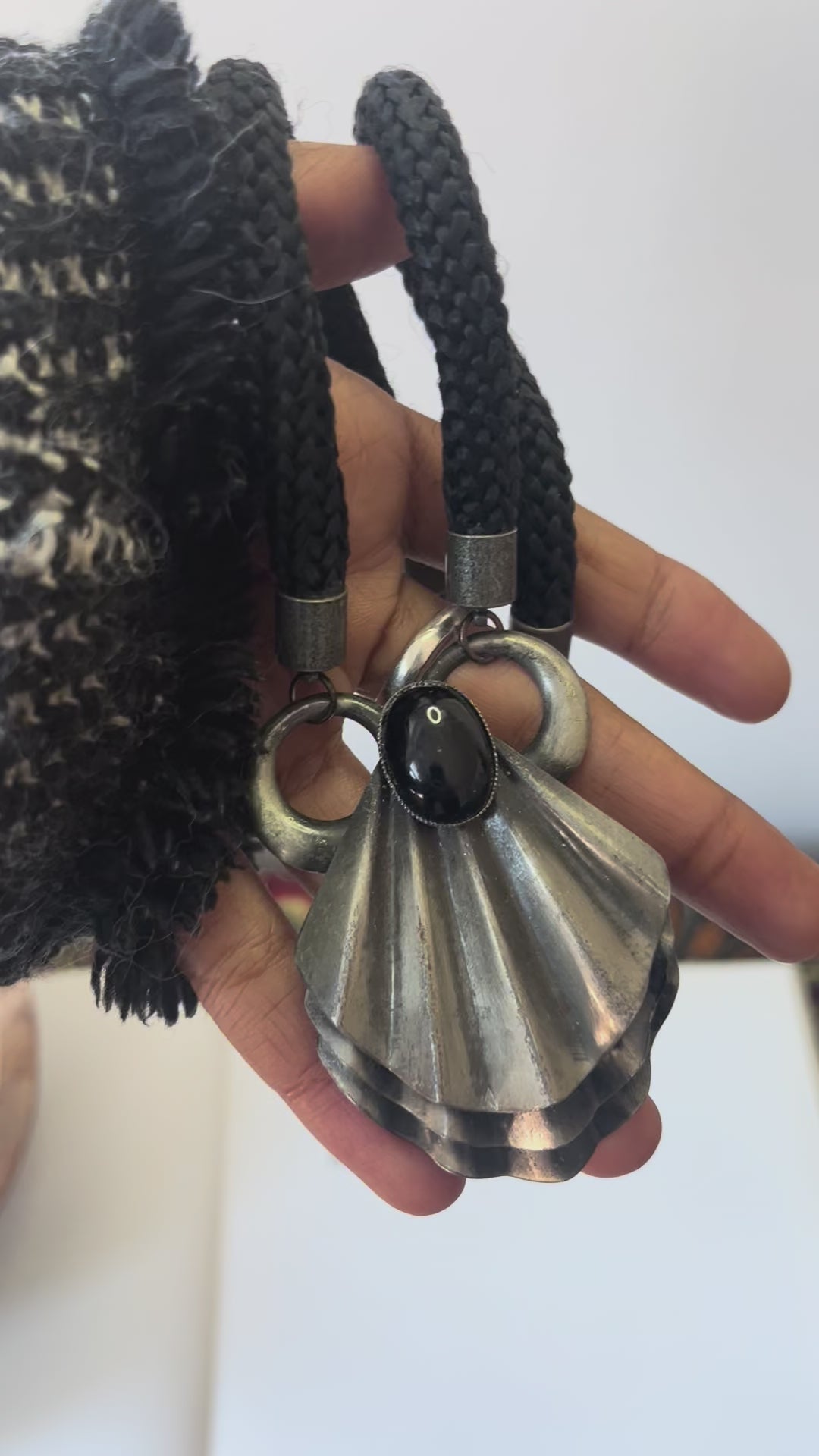 This bold vintage necklace features a thick black braided cord and an oversized sculptural shell-shaped pendant. The pendant is finished in a silver-tone metal and accented with a glossy black cabochon at the center, giving it a dramatic, elevated look.
