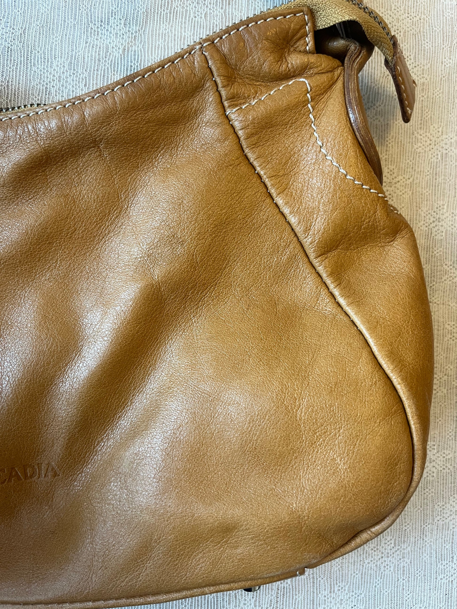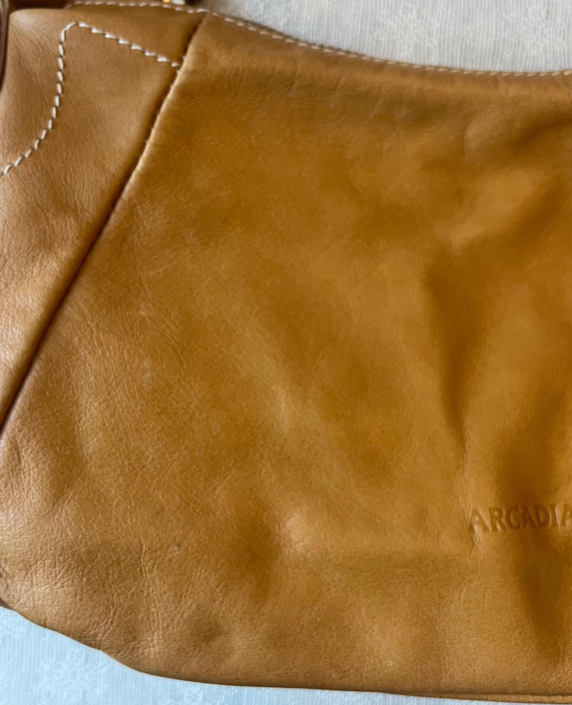 Soft, slouchy vintage Arcadia shoulder bag in rich cognac brown leather. Beautifully broken-in with a luxe, buttery feel and subtle natural creasing that gives it that effortless early-2000s Italian look.
