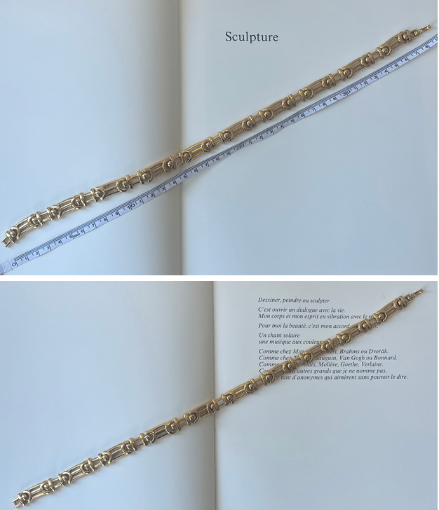 Elegant vintage Nina Ricci necklace featuring a sculptural gold-tone link design with repeating curved and tubular elements. The architectural construction sits beautifully at the collarbone, creating a bold yet refined statement that reflects the house’s signature Parisian elegance.