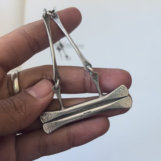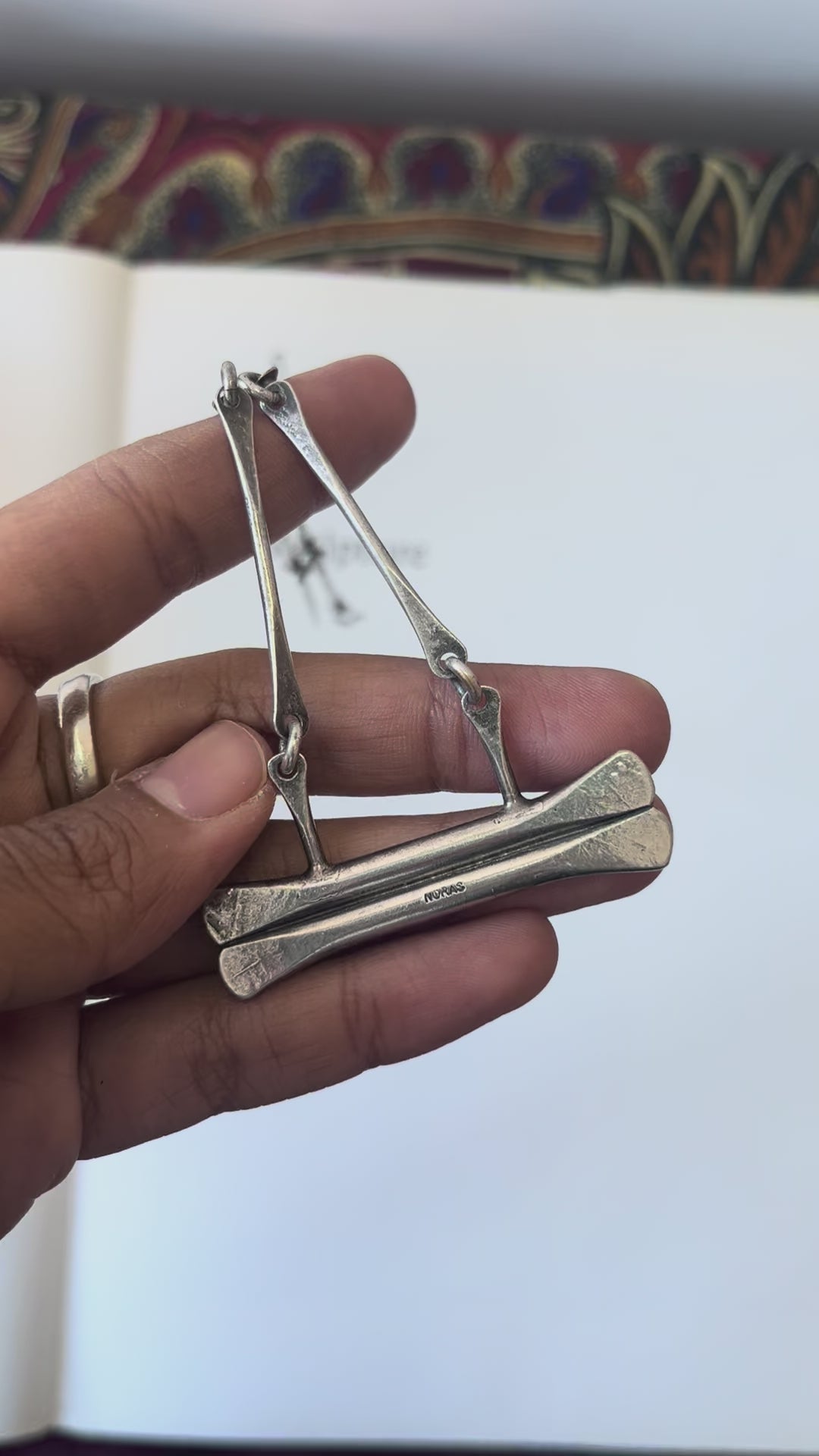Elegant and architectural vintage necklace by Nina Ricci, featuring a sculptural horizontal bar pendant suspended from a sleek articulated chain. The pendant’s softly flared ends and high-polish finish give the piece a refined, modernist presence that feels both timeless and unmistakably designer.
