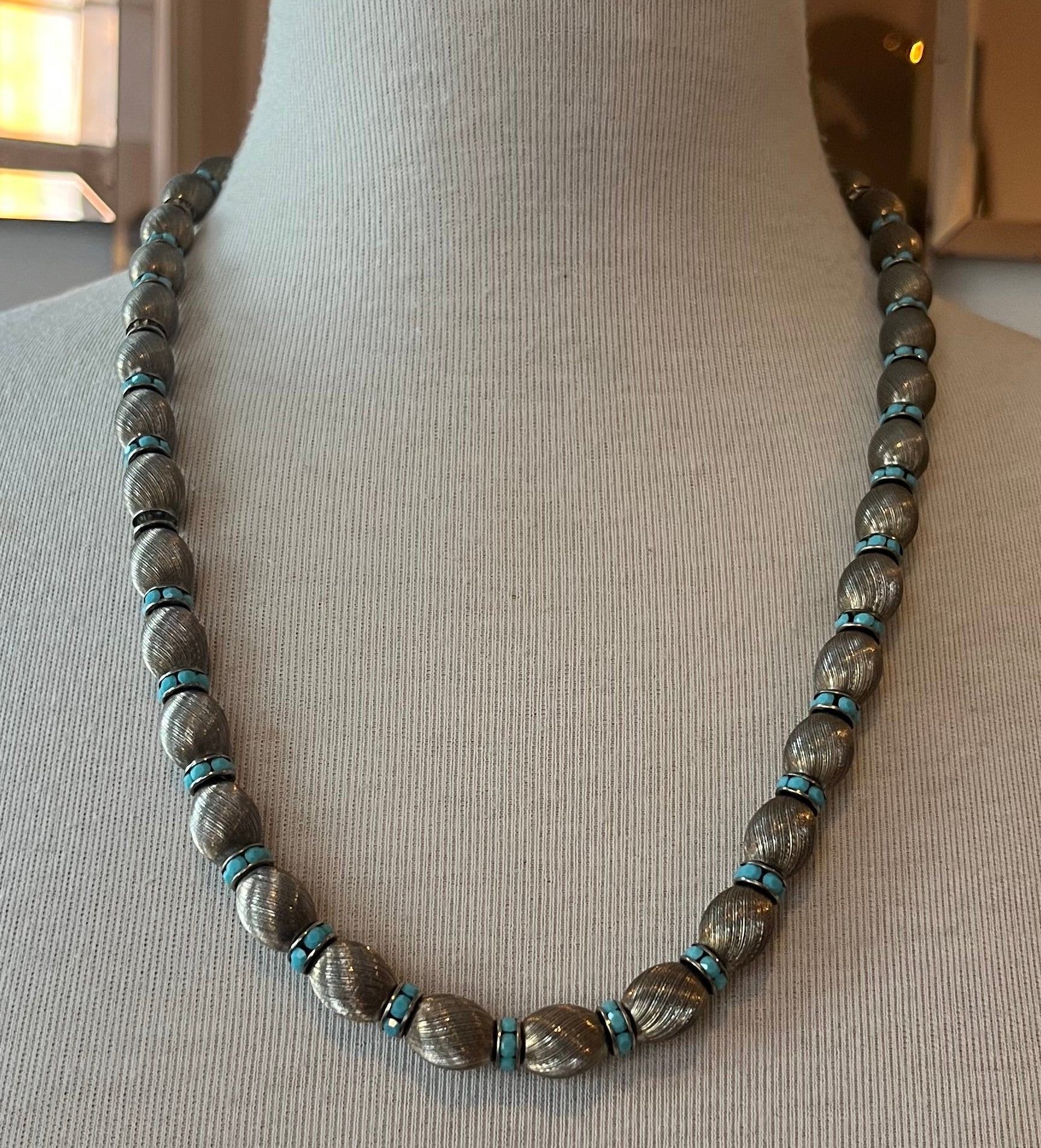Striking vintage necklace featuring brushed silver-tone oval beads accented with vibrant turquoise spacer details. The textured metal gives it a soft, almost satin finish that contrasts beautifully with the bright blue stones.